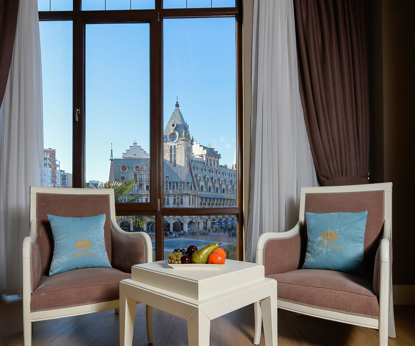 Oda içinde lüks bir kral (büyük boy) yatak bulunan ayrı bir yatak odası, rahat bir kanepe, sehpa, koltuklar ve TV içeren bir oturma odası, ayrıca yemek alanı ve salon bulunmaktadır. Geniş banyo duş, bide ve jakuzili küvet ile donatılmıştır. Batum merkezinin nefes kesen manzarası, konaklamanızı daha da zevkli hale getirecektir.